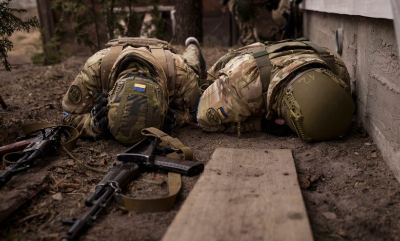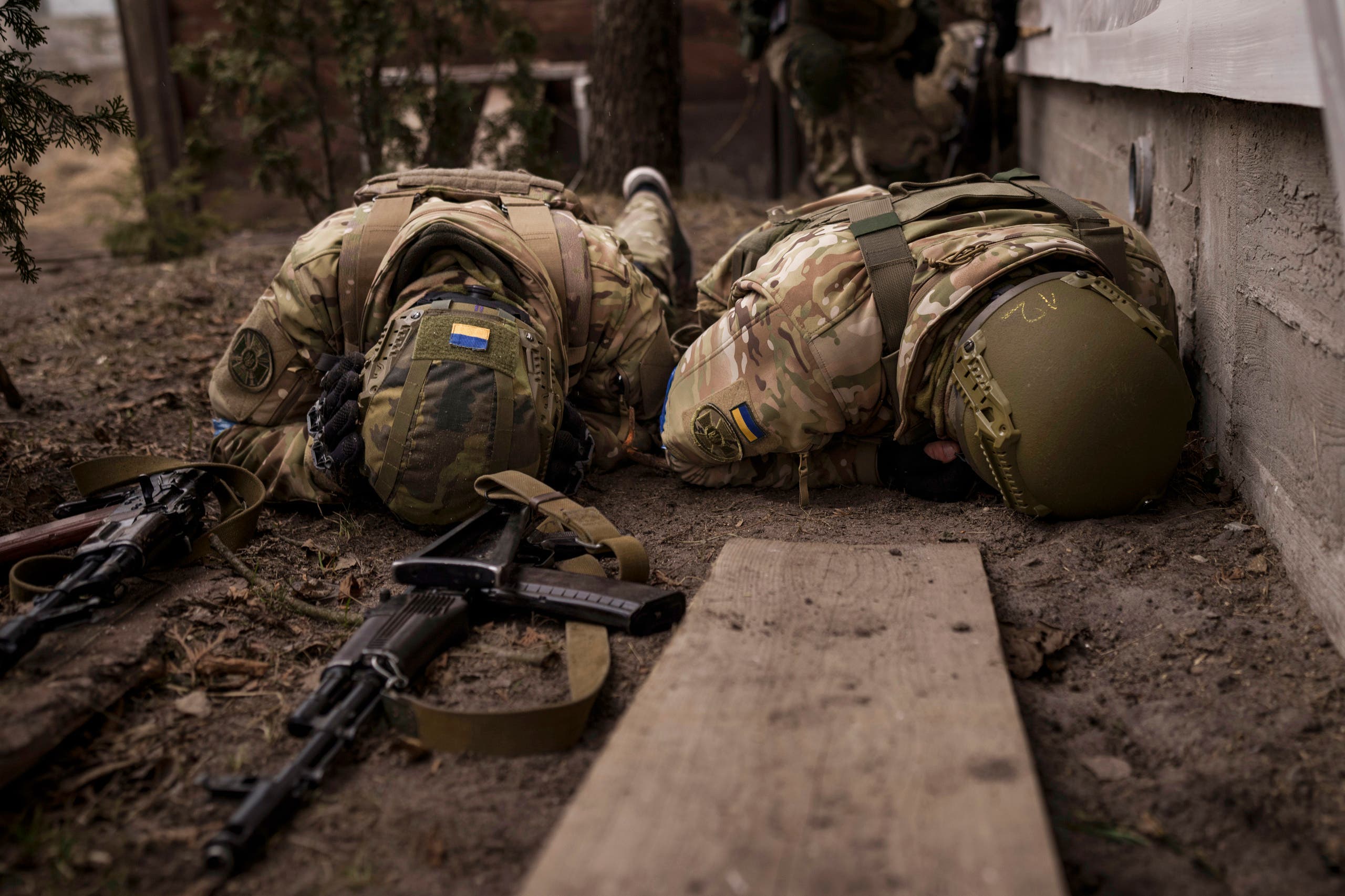 جنديان أوكرانيان يحتميان أرضاً خلال قصف روسي في اربين في محيط كييف