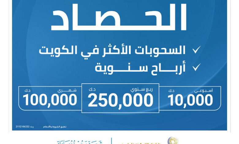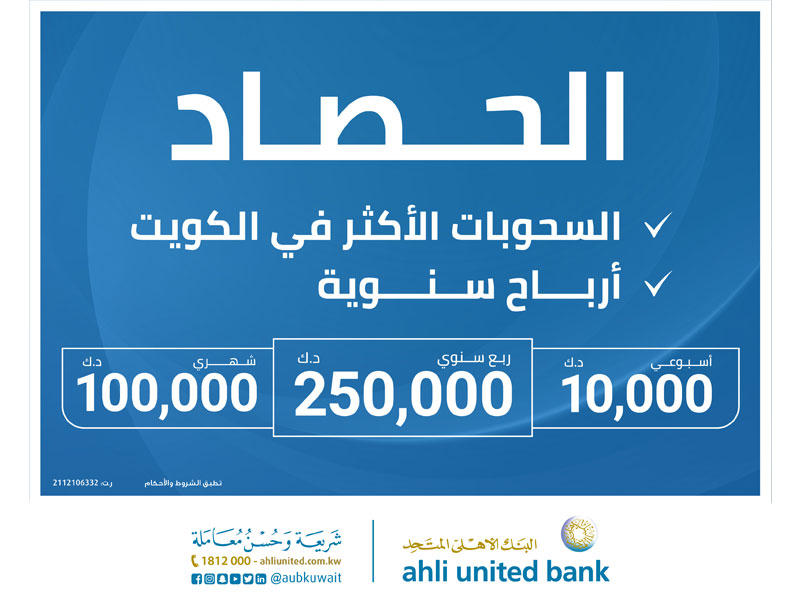 أجرى البنك الأهلي المتحد، اليوم، السحب الأسبوعي على جوائز الحصاد الإسلامي، حساب السحب على الجوائز الإسلامي الأول في الكويت، والذي ينفرد بالعديد من المميزات، ومنها أنه أبسط وأسهل برنامج ادخار، فضلا عن ميزة فتح الحساب عبر الانترنت بكل سهولة ويسر، مع ميزة الإيداع الفوري في الحساب.,وأسفر السحب عن حصول 10 من العملاء على 1000 دينار لكل منهم وهم: ريهام مشاري الفوزان، وابراهيم عبدالله القفيلي، وداود سليمان الحساوي، ورحاب لحدان اللحدان، ونورة خويلد الهاجري، ومحمد عدنان الريس، ونادية مناور العنزي، وسهيلة عبدالرضا نجف، وعذاري لاحق العتيبي، وصالح عبدالحميد المنصور.,ويقدم «الحصاد الإسلامي» في باقته الجديدة مجموعة أوسع من المزايا، إذ يحظى الرابحون من عملاء «المتحد» بجائزة شهرية بقيمة 100.000 دينار، بالإضافة إلى 10 جوائز أسبوعية بقيمة 1.000 دينار لكل جائزة.