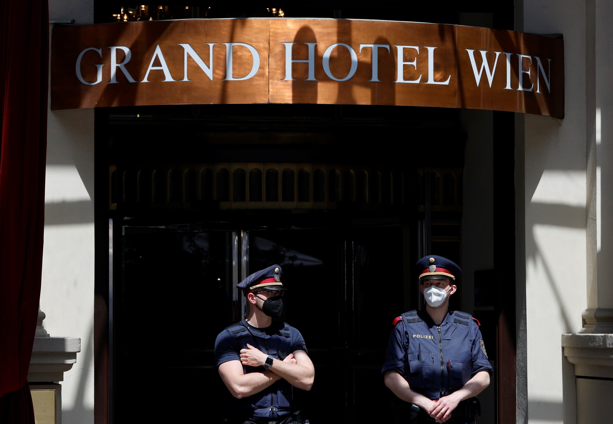 من أمام فندق غراند هزتيل حيث تجري مفاوضات فيينا حول الاتفاق النووي الإيراني (أرشيفية- رويترز)