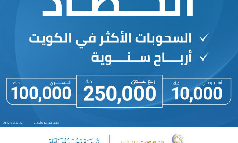 أجرى البنك الأهلي المتحد، أمس ، السحب الأسبوعي على جوائز الحصاد الإسلامي، حساب السحب على الجوائز الإسلامي الأول في الكويت، والذي ينفرد بالعديد من المميزات، ومنها أنه أبسط وأسهل برنامج ادخار، فضلا عن ميزة فتح الحساب عبر الإنترنت بكل سهولة ويسر مع ميزة الإيداع الفوري في الحساب.,وأسفر السحب عن حصول 10 من العملاء على 1000 دينار كويتي لكل منهم، وهم: أحمد عبدالله أحمد، وهادي ناجي القلاف، وعبدالله محسن حاجي، وليلى حسين رجبئس، وبشرى كامل حميد، وسعد عمير العجمي، وسيد أحمد عطا الله عبدالرحيم، وعصام أحمد المذن عصام، ونادية مختار أحمد، وسونيا محمود أحمد.,ويقدم الحساب في باقته الجديدة مجموعة أوسع من المزايا، حيث يحظى الرابحون من عملاء «المتحد» بجائزة شهرية بقيمة 100,000 د.ك. بالإضافة إلى 10 جوائز أسبوعية بقيمة 1,000 دينار لكل جائزة.,وتبقي الجوائز ربع السنوية الكبري بقيمة 250,000 د.ك. نقدا للرابح هي أهم ما يطمح إليه العملاء، حيث تمثل لهم فرصة حقيقية لتحقيق حلم العمر، وفضلا عن هذه الباقة من الجوائز الجذابة، هناك أيضاً أرباح سنوية متوقعة على أساس عقد الوكالة، وهو ما يزيد من جاذبية حساب الحصاد الإسلامي.