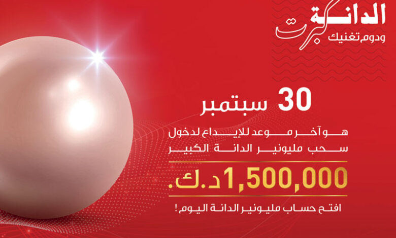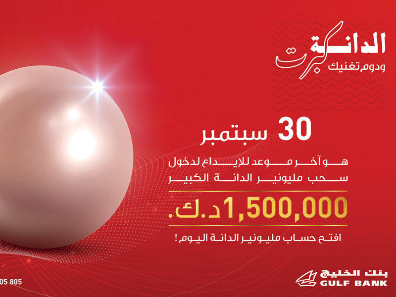 أعلن بنك الخليج أن فرص الإيداع والتأهل لسحب الدانة السنوي الكبير تنتهي الجمعة المقبل، والذي يؤهل لربح جائزة تبلغ قيمتها 1.500.000 دينار، علما أن إعلان الفائز سيتم في 19 يناير 2023، بحضور ممثلي وزارة التجارة والصناعة، وشركة إرنست آند يونغ (Ernst & Young).,ويقدم حساب الدانة من بنك الخليج العديد من الفرص لمكافأة العملاء على ادخارهم ومواظبتهم على التوفير، حيث يقدم الحساب سحوبات شهرية للفوز بألف دينار لعشرة فائزين، إضافة إلى سحبين ربع سنويين جائزة كل منهما 100.000 دينار، وسحب نصف سنوي جائزته 1.000.000 دينار، فضلا عن جائزة المليون ونصف المليون دينار.,وكل ما يتعين على العميل للمشاركة في هذه السحوبات أن يفتح حساب الدانة، ويودع فيه قبل آخر موعد للإيداع والتأهل، وأن يحافظ على المبلغ المودع في الحساب بألا يقل عن 200 دينار، أو أن يزيده للحصول على فرص ربح أكثر باستمرار. الجدير بالذكر أنه يمكن لعملاء بنك الخليج فتح حساب الدانة والإيداع فيه إلكترونيا عن طريق التطبيق أو الموقع الإلكتروني.,وكان بنك الخليج أعلن مؤخرا المليونيرة الأولى التي فازت بسحب الدانة نصف السنوي، ويتطلع للإعلان عن المليونير الثاني الذي سيحصل على جائزة المليون ونصف المليون دينار، ويعد حساب الدانة أحد أقدم وأعرق حسابات التوفير في الكويت، وقد تم تصميمه لتشجيع ثقافة الادخار في المجتمع، ولمكافأة المدخرين على التزامهم بالادخار بشكل منتظم، ولهذا نشجع الجميع على فتح حساب الدانة والادخار فيه، والتمتع بجميع المزايا التي يقدمها لعملائه.,