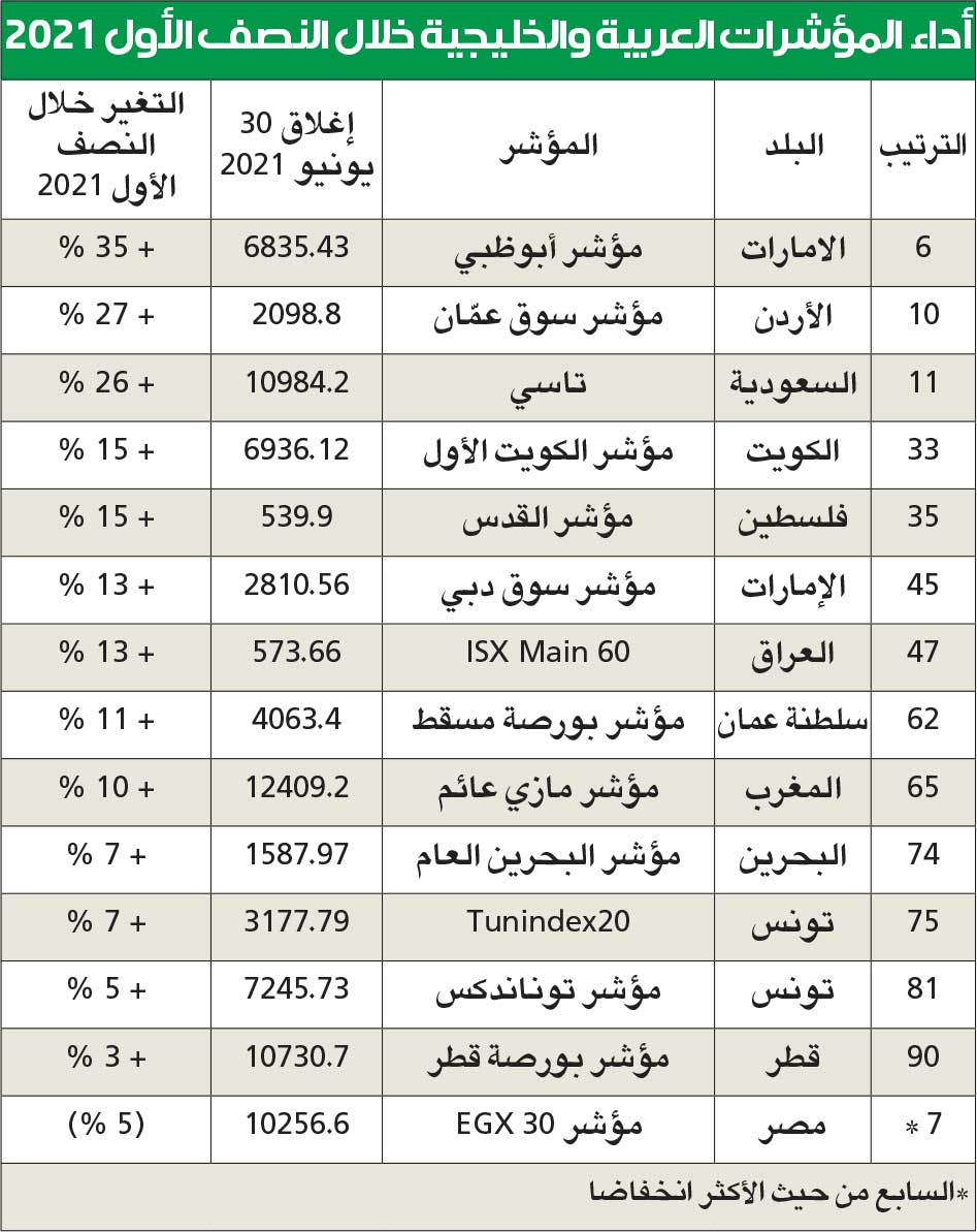 رصدت «أرقام» في هذا التقرير أداء الأسواق العالمية خلال النصف الأول من عام 2021، والتي شملت نحو 107 مؤشرات رئيسة، ارتفع منها 93 مؤشرا، مقابل تراجع 14.,وشهدت أغلب المؤشرات العالمية الرئيسة ارتفاعات بنسب متفاوتة بفضل تعافي الاقتصاد العالمي تدريجيا، إضافة إلى سياسات التحفيز المالية التي تتبعها الحكومات، مع عودة أوضاع الحياة الطبيعية إلى ما قبل الجائحة بشكل تدريجي، تزامنا مع تسريع وتيرة اللقاح خلال الفترة الحالية.,كما يسلّط التقرير الضوء على أهم الأحداث الاقتصادية التي تأثرت بها الأسواق العالمية، حيث شهد النصف الأول من العام الحالي العديد من الأحداث التي أثّرت على حركة التداولات في الأسواق بشكل مباشر، كان أهمّها ما يلي:,التدابير المالية: شهد النصف الأول للعام الحالي عدة سياسات وتدابير مالية أغلبها كان بإبقاء أسعار الفائدة دون تغيّر وعند مستويات منخفضة، كان أهمها «الفدرالي» وتصريحاته بمواصلة برنامج شراء السندات بقيمة 120 مليار دولار شهريا، مع إبقاء أسعار الفائدة عند مستويات الصفرية، مع توقّعات برفع الفائدة مرتين خلال عام 2023.,النفط الخام: ارتفعت أسعار النفط بمعدل 45 بالمئة خلال النصف الأول من 2021، وصولا إلى مستويات 75 دولارا للبرميل، وذلك بفضل تحسُّن ميزان العرض والطلب، وإبقاء سياسة منظمة أوبك على مستويات الإنتاج منخفضة خلال الفترة السابقة، إضافة إلى التوقعات الإيجابية بشأن تعافي الطلب على الخام خلال النصف الثاني 2021 وزيادة معدلات إنتاج دول المنظمة.,لقاح فيروس كورونا: حثّت جميع الدول على تسريع وتيرة لقاح الأفراد، إلى أن وصل معدل اللقاحات أكثر من 3 مليارات لقاح خلال النصف الأول من 2021.,وعلى جانب أداء الأسواق العالمية، جاء أغلب أداء المؤشرات الرئيسية العالمية في المنطقة الخضراء، حيث تضمنت الأكثر ارتفاعا 4 دول عربية: لبنان والإمارات والأردن والسعودية، حيث حقق مؤشر «سوق أبوظبي» ارتفاعات بنسبة 35 بالمئة ليغلق عند مستوى 6835 نقطة، مضيفاً لرصيده 1790 نقطة منذ بداية العام، تلاه مؤشر «BLOM Stock» لسوق لبنان في المرتبة السابعة عالميا، بنسبة ارتفاع 34 بالمئة، بالرغم من الظروف التي يمرّ بها الاقتصاد اللبناني من معدلات تضخم مرتفعة بشكل كبير، إضافة إلى تراجع معدلات العملة أمام الدولار إلى مستويات قياسية.,في حين جاء مؤشر السوق السعودي «تاسي» في المرتبة العاشرة عالميا بنسبة ارتفاع 26 بالمئة، ليتمكن من اختراق مستوى الـ 11000 نقطة في آخر جلسة لأول مرة منذ عام 2014.,