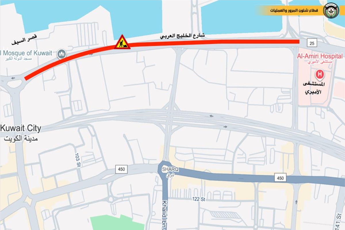 أعلنت الإدارة العامة للمرور عن إجراء أعمال صيانة على شارع الخليج العربي تتطلب تنفيذ إغلاقات مرورية مؤقتة لإجراء الصيانة اللازمة للطريق.وأوضحت الإدارة أنه سيتم إغلاق شارع الخليج الع…