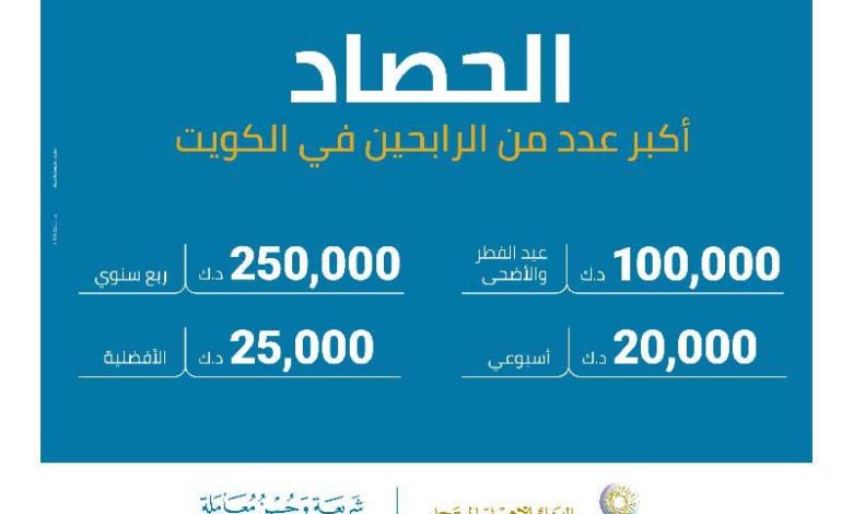 أجرى البنك الأهلي المتحد، أمس الأول، السحب الأسبوعي على جوائز الحصاد الإسلامي، حساب السحب على الجوائز الإسلامي الأول في الكويت، والذي يقدم ما يزيد على 750 جائزة سنويا، وينفرد بالعديد من المميزات، منها أنه أبسط وأسهل برنامج ادخار، ويقدم أكبر قيمة من الجوائز إلى أكبر عدد من الفائزين، فضلا عن ميزة فتح الحساب عبر الإنترنت بكل سهولة ويُسر، مع ميزة الإيداع الفوري في الحساب. وأسفر السحب عن حصول 20 فائزا على 1000 دينار لكل منهم، وهم: لطفي شوقي درويش، طارق عبدالعزيز العبدالعالي، وسمية سعد المطيري، وجيهة محمد آل رشيد، وضحة خضر الظفيري، باسمة حسن الحساني، محمد عيسى الكسابرة، نجوى محمد الشربيني، بدر محمد العتيبي، شاكر محمود خليفة، مريم حمد الملا، زايد مداد العازمي، عدوان عبدالله المطيري، ياسر تن، حسين إبراهيم حاجي، حسان عبدالسلام، زلفى زيد الزيد، عبدالله علي أبوأرحمة، مبارك فهاد عبدالله ولولوة محمد الدخيل.,وتتضمن سحوبات “الحصاد” العديد من الجوائز، من بينها جائزة بقيمة 100 ألف دينار في كل من عيد الفطر وعيد الأضحى، وتبقى الجائزة ربع السنوية الكبرى بقيمة 250 ألف دينار أهم ما يطمح إليه العملاء لتحقيق تطلعاتهم. كذلك، تقدم جوائز “الحصاد” 20 جائزة أسبوعية بقيمة ألف دينار لكل رابح. ولأول مرة في الكويت، تم تقديم “سحب الأفضلية” ربع السنوي بقيمة 25 ألف دينار حصريا للعملاء الذين لم يحالفهم الحظ من قبل بأي من جوائز “الحصاد” خلال السنوات الخمس الأخيرة، بشرط مرور عام على فتح حساباتهم، وتتيح كل 50 دينارا في حساب العملاء ضمن هذه الفئة فرصة واحدة للدخول في السحب.