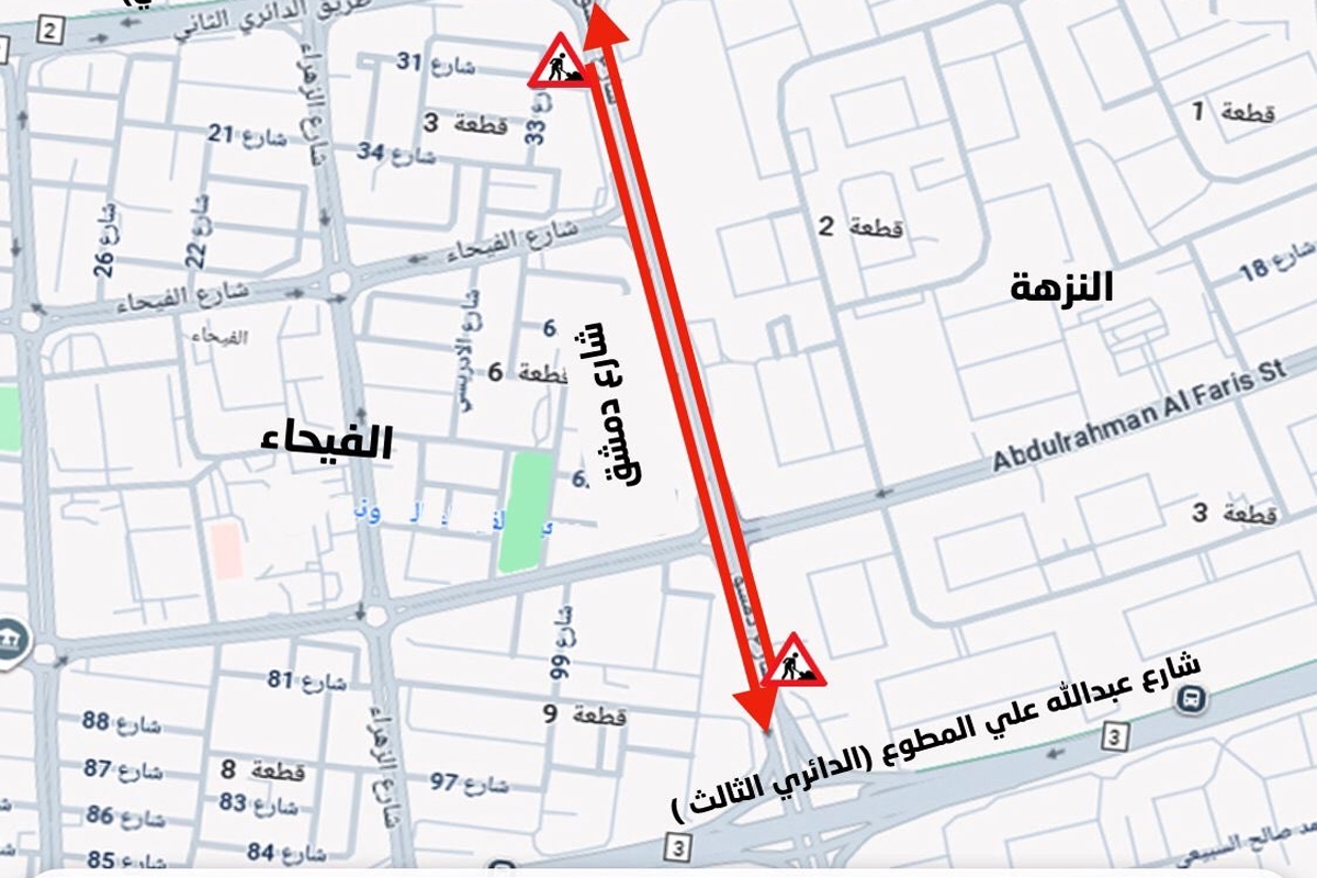 أعلنت الإدارة العامة للمرور، اليوم الجمعة، إغلاق الحارتين السريعة والوسطى على شارع دمشق بالاتجاهين، بداية من تقاطع طريق الدائري الثاني إلى تقاطع «الثالث»، اعتباراً من يوم غد السبت…