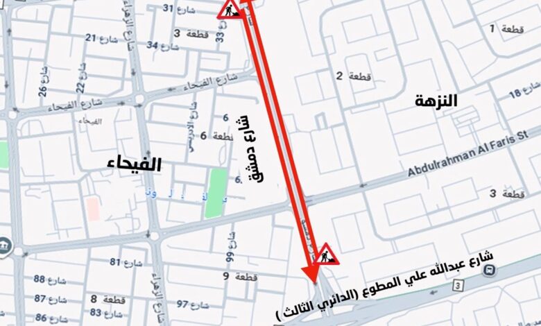 أعلنت الإدارة العامة للمرور، اليوم الجمعة، إغلاق الحارتين السريعة والوسطى على شارع دمشق بالاتجاهين، بداية من تقاطع طريق الدائري الثاني إلى تقاطع «الثالث»، اعتباراً من يوم غد السبت…