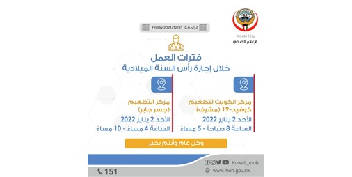 يتوقف مركز الكويت للتطعيم في أرض المعارض بمشرف، ومركز جسر الشيخ جابر الأحمد للتطعيم عن العمل يوم غد السبت، الموافق الأول من يناير بمناسبة اجازة رأس السنة، على ان يعاود المركزان العمل يوم الاحد 2 يناير.