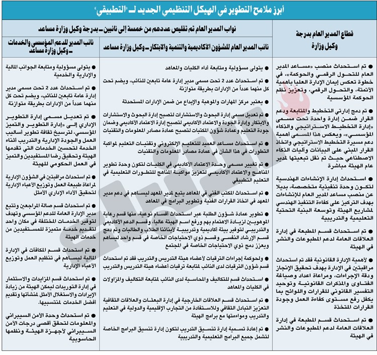 وتابع: تم استحداث قسم المطبعة في إدارة العلاقات العامة لدعم المطبوعات والنشر في الهيئة، ولما للإدارة القانونية من أهمية فقد تم استحداث مراقبتين في الإدارة بهدف تحقيق الإنجاز ودقة الإجراءات، ومراعاة إعداد وصياغة الفتاوى والمذكرات القانونية وتوحيد التفسير القانوني للقرارات واللوائح بما يكفل رفع مستوى كفاءة العمل وجودة القرارات المتخذة وبخصوص نواب المدير العام فقد تم تقليص عددهم من 5 إلى نائبين، وهما: نائب المدير العام – وكيل وزارة مساعد – للشؤون الأكاديمية والتنمية والابتكار، حيث يتولى مسؤولية ومتابعة أداء الكليات والمعاهد، واستحداث 2 مسمى مدير إدارة عامة تابعين للنائب، ويضم تحت كل منهما عددا من الإدارات بطريقة متوازنة، حيث يعتبر مركز المهارات والموهبة والإبداع من ضمن الإدارات المستحدثة وتم تعديل مسمى إدارة البحوث والاستشارات وإدارة الجودة والاعتماد الأكاديمي وعمادة شؤون المكتبات ليصبح إدارة البحوث والاستشارات والابتكار وإدارة الاعتماد الأكاديمي وضمان جودة التعليم وعمادة مصادر المعلومات والتقنيات، كما تم استحداث مساعد العميد للتعليم الإلكتروني وتقنيات التعليم لمواكبة التطورات في هذا الشأن في عمادة مصادر المعلومات والتقنيات.