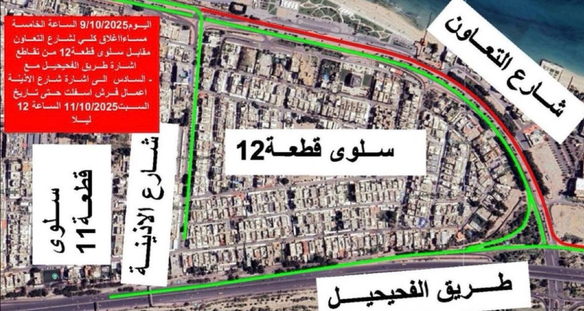 أعلنت وزارة الأشغال العامة بالتعاون مع الادارة العامة المرور عن إغلاق كلي الليلة لشارع التعاون مقابل منطقة سلوي قطعة 12 من تقاطع إشارة طريق الفحيحيل إلي إشارة شارع علي ثنيان الأذين…