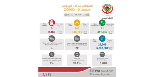 أعلنت وزارة الصحة اليوم عن تسجيل 240 إصابة جديدة بفيروس كورونا المستجد في الساعات الـ 24 الماضية ليرتفع بذلك إجمالي عدد الحالات المسجلة في البلاد إلى 415151 حالة في حين لم يتم تسجيل اي حالة وفاة ليصبح مجموع حالات الوفاة المسجلة حتى الآن 2468 حالات.