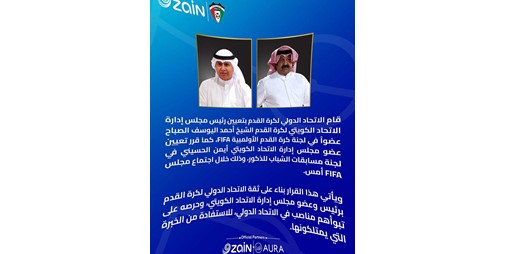 قام الاتحاد الدولي لكرة القدم بتعيين رئيس مجلس إدارة اتحاد كرة القدم الشيخ أحمد اليوسف الصباح عضواً في لجنة كرة القدم الأولمبية FIFA، كما قرر تعيين عضو مجلس الإدارة أيمن الحسيني في لجنة مسابقات الشباب للذكور، وذلك خلال اجتماع مجلس FIFA أمس.