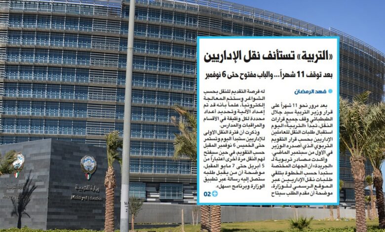 تأكيداً لما نشرته الجريدة في عددها لليوم الأحد تحت عنوان («التربية» تستأنف نقل الإداريين).. أعلنت وزارة التربية فتح باب النقل الإلكتروني للإداريين العاملين في المدارس بجميع المناطق…