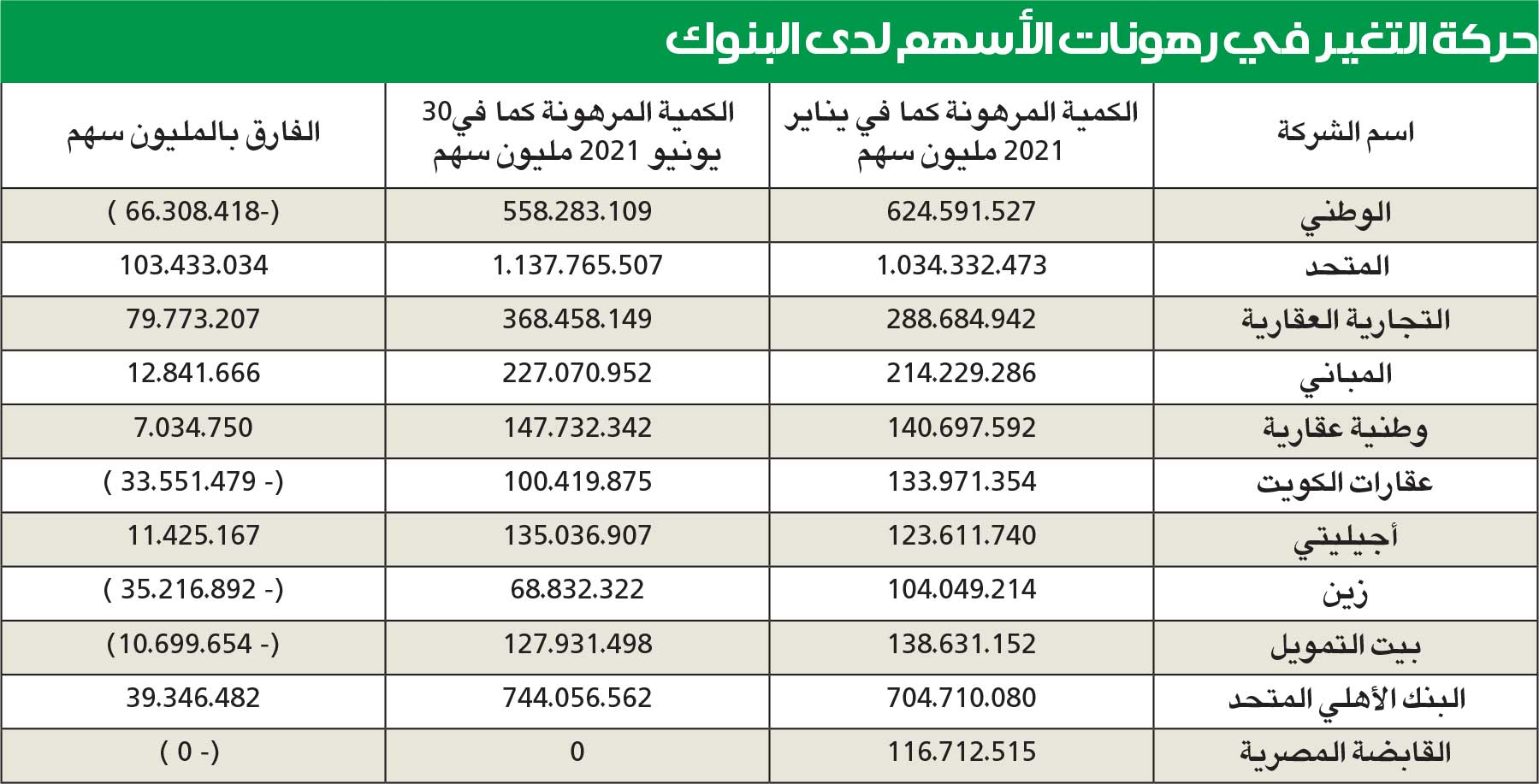 رصدت “الجريدة” حركة رهونات الأسهم مقابل التمويل المصرفي، خلال النصف الأول، حيث شهدت عمليات التمويل مقابل الأسهم كرهونات جديدة زيادة خلال النصف الأول، وتم تقديم كمية أسهم جديدة كرهن مقابل تمويل بكمية تبلغ 253.85 مليون سهم، خصوصا من الأسهم الممتازة القيادية، حيث تقدر قيمتها السوقية وفق أسعار نهاية الأسبوع الماضي بما قميته 62.096 مليون دينار. ,وقابل عمليات الزيادة في التمويل تحرير لكمية أسهم بلغت 262.488 مليون سهم بلغت قيمتها السوقية 129.6 مليون دينار، حيث كان من أبرز الأسهم التي تم تحريرها 59.279 مليوناً من أسهم البنك الوطني، في حين جاءت في المرتبة الثانية أسهم القابضة المصرية، حيث تم سداد المديونية مقابل الأسهم، اضافة الى عقارات الكويت التي تم تحرير كمية أسهم بلغت 33.5 مليون سهم قيمتها نحو 4.4 ملايين. ,وإجمالا يمكن الإشارة إلى أن حركة التغيرات الإيجابية في التمويل مقابل ضمانات الأسهم، تؤشر إلى انفتاح البنوك من جديد على القبول بضمانات الاسهم، لا سيما في ظل الوفرة الكبيرة في السيولة، وفي المقابل التزام لافت من جانب الشركات في السداد في المواعيد المحددة، وتراجع مستويات التعثر، خصوصا أن اغلب عمليات التمويل باتت توجه لمشاريع فعلية وفرص تشغيلية ولآجال طويلة، على عكس السابق، عندما كان التمويل لآجال قصيرة ويوجه لفرص مضاربية سريعة محفوفة بالمخاطر. ,في سياق آخر، أشارت مصادر مصرفية إلى أن هناك العديد من طلبات التمويل الكبرى من عدد من الشركات يتم تقييمها حاليا، خصوصا لتمويل بعض المشاريع، في ضوء اتضاح الصورة نسبيا وعودة الانفتاح التدريجي، حيث إن أغلب طلبات التمويل الكبرى كانت مرحلة لحين استقرار الأوضاع، مشيرة إلى أنه في ضوء تباطؤ التمويل الاستهلاكي والشخصي بسبب وفرة السيولة وضعف الداخلين الجدد لسوق العمل، فتقابل المصارف تلك المتغيرات بمرونة أكبر في تمويل القطاع الخاص لتعويض التراجع والتباطؤ. ,