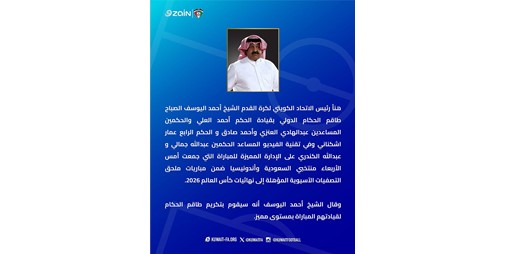 هنأ رئيس اتحاد كرة القدم الشيخ أحمد اليوسف الصباح طاقم الحكام الدولي، بقيادة الحكم أحمد العلي والحكمين المساعدين عبدالهادي العنزي وأحمد صادق والحكم الرابع عمار أشكناني وفي تقنية الفيديو المساعد الحكمين عبدالله جمالي وعبدالله الكندري، على الإدارة المميزة للمباراة التي جمعت أمس الأربعاء منتخبي السعودية وإندونيسيا ضمن مباريات ملحق التصفيات الآسيوية المؤهلة إلى نهائيات كأس العالم 2026.