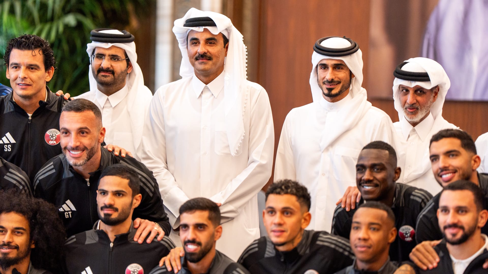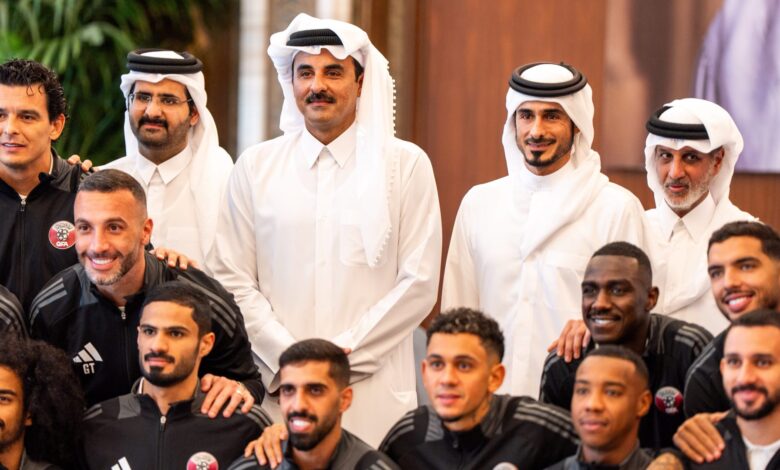 وأظهرت لقطات مصورة، نشرها حساب الديوان الأميري في قطر عبر منصة “إكس”، الشيخ تميم بن حمد وهو يصافح ويعانق اللاعبين وأعضاء الجهازين الفني والإداري، قبل أن يهنئهم بالوصول إلى المونديال.