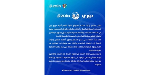 طالب مجلس إدارة اتحاد كرة القدم أندية دوري زين للدرجتين الممتازة والأولى بالالتزام بالنظم واللوائح المنصوص عليها في لائحة المسابقات، والخاصة بعملية تنظيم دخول وخروج الجماهير، وكذلك تنظيم عملية التواجد في المنصات الرئيسية للأندية.
