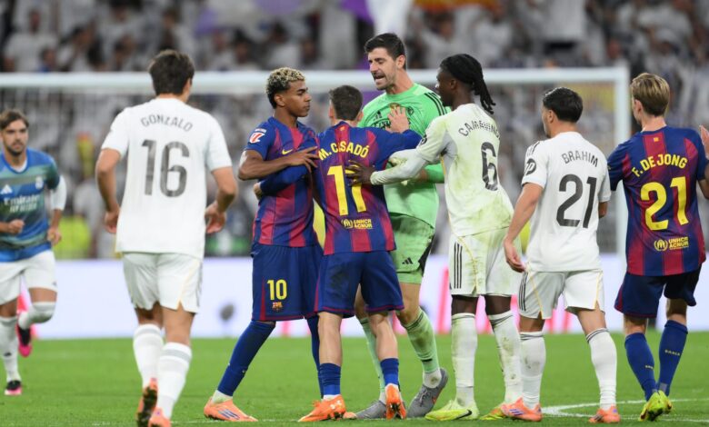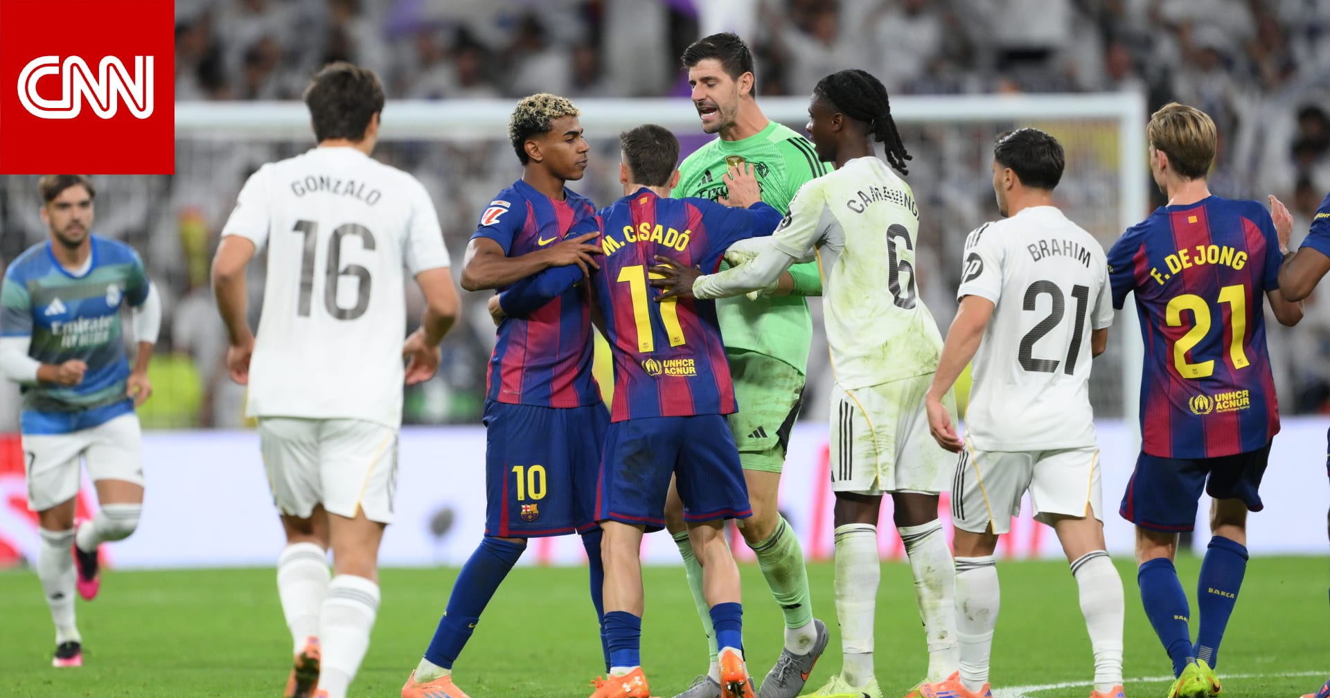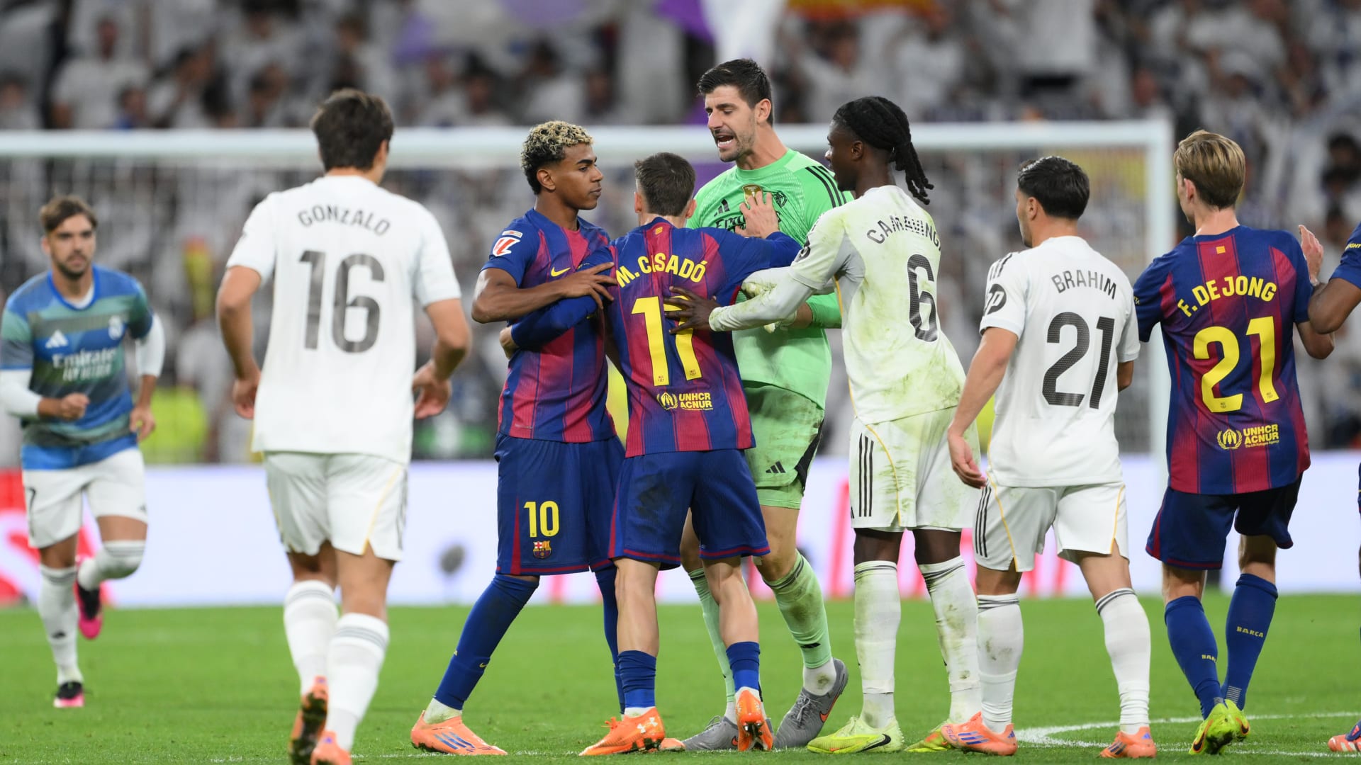 - حدثت مشادة عقب صافرة النهاية، إذ توجه لاعبو ريال مدريد نحو لاعب المنافس، لامين يامال، ووجهوا له بعض الكلمات، في حين شوهد الحارس تيبو كورتوا وفينيسيوس وهما يقومان ببعض الإشارات ضدّ البالغ من العمر 18 عامًا.