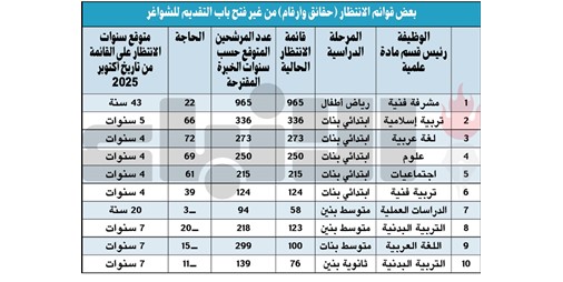 وكشف التقرير البيانات المتاحة قبل صدور القرار عن اختلال واضح في منظومة التسكين، إذ بلغ عدد المنتظرات لتولي مهام الإشراف في رياض الأطفال نحو 967 متقدمة مقابل حاجة فعلية لا تتجاوز 22 وظيفة فقط، أي أن فترة الانتظار قد تمتد نظريا لأكثر من 43 عاما في حال استمرار النظام السابق دون تعديل، وتكررت الصورة ذاتها في تخصصات أخرى مثل التربية الإسلامية واللغة العربية والعلوم للمرحلة الابتدائية بنات، حيث تراوحت فترات الانتظار بين 4 و5 سنوات، مقابل أعداد محدودة من الوظائف المتاحة، مشيرا إلى انه تراوحت كذلك فترة الانتظار في بعض التخصصات مثل الدراسات العملية للمرحلة المتوسطة بنين 20 سنة تقريبا. والتربية البدنية للمرحلتين المتوسطة والثانوية حوالي 7 سنوات في حال كانت عجلة التسكين سنوية، ومع إغلاق باب التقديم للتخصصات المذكورة في قائمة الانتظار.