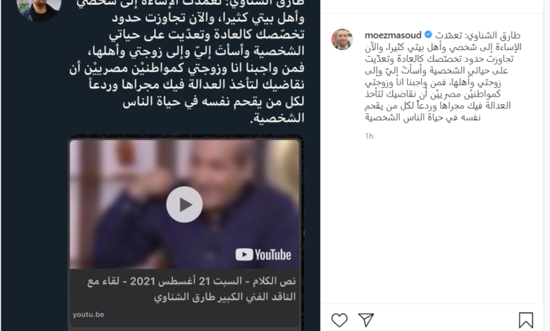 ولم يذكر معز مسعود الأسباب التي دفعته إلى اتخاذ مثل هذا القرار، وما الذي أغضبه في ظهور الشناوي، وأغلق خاصية التعليق على ما نشره عبر “انستغرام”.