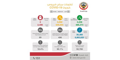 أعلنت وزارة الصحة اليوم تسجيل 5592 إصابات جديدة بفيروس كورونا المستجد (كوفيد-19) في الساعات الـ 24 السابقة، ليرتفع بذلك إجمالي عدد الحالات المسجلة في البلاد الى 539654.